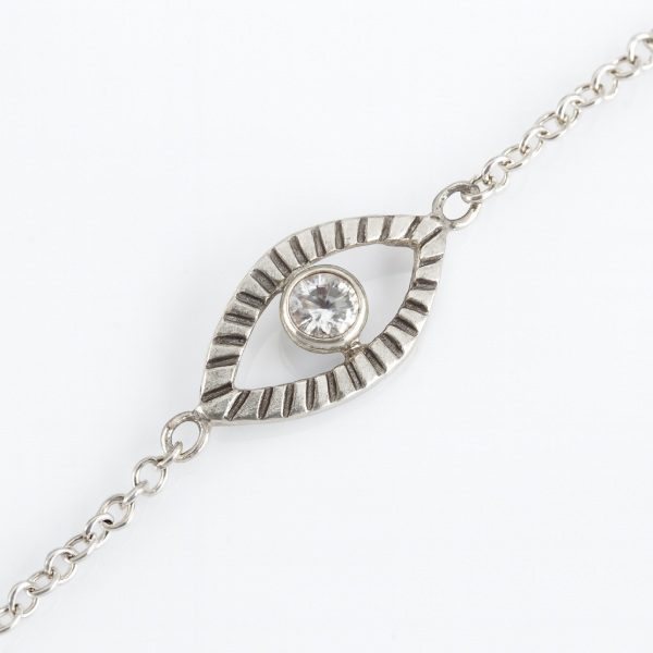 Delicada y elegante, esta pulsera de Plata 925 presenta un dije central en forma de ojo, finamente detallado con un grabado radial y un brillante circonia engarzado en el centro. Su diseño minimalista y simbólico la convierte en una pieza ideal para uso diario o como amuleto de protección.