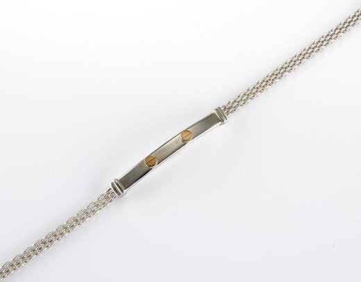 Diseño con carácter y elegancia. Esta pulsera de plata 925 combina una trama doble de cadenas con una placa central destacada por sutiles detalles en dorado, creando un contraste moderno y sofisticado. Una pieza que transmite presencia, ideal para quienes buscan una joya versátil con estilo propio.