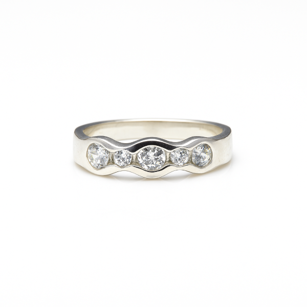 Un diseño clásico con un giro sutil. Este anillo en plata 925 presenta una delicada línea ondulada que aloja cinco cristales transparentes de brillo impecable, dispuestos de mayor a menor para lograr un equilibrio visual encantador. Su forma suave y orgánica realza la silueta del dedo, convirtiéndolo en una opción ideal tanto para llevar solo como para combinar con otras piezas.