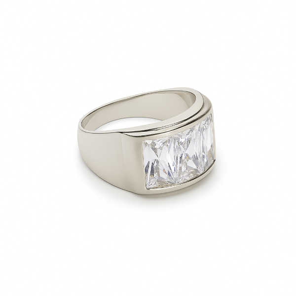 Una joya con carácter, diseñada para destacar. El anillo “Janus” en plata 925 presenta un cuerpo ancho, sólido y pulido, que enmarca tres piedras corte esmeralda de gran presencia. Su diseño sobrio y sofisticado combina la fuerza de lo clásico con el impacto de lo moderno, ideal para quienes buscan una pieza poderosa que hable por sí sola.