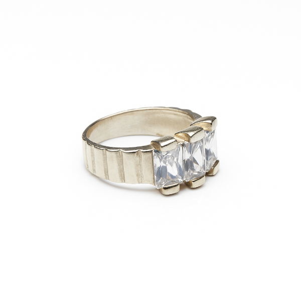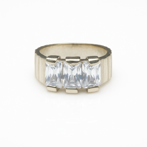 Audaz, sólido y absolutamente brillante. Este anillo en plata 925 destaca por sus tres imponentes piedras corte esmeralda que capturan la luz con una claridad hipnótica. Su banda ancha texturada le aporta carácter y fuerza, convirtiéndolo en una joya con estilo propio, perfecta para quienes pisan fuerte y se animan a todo.
