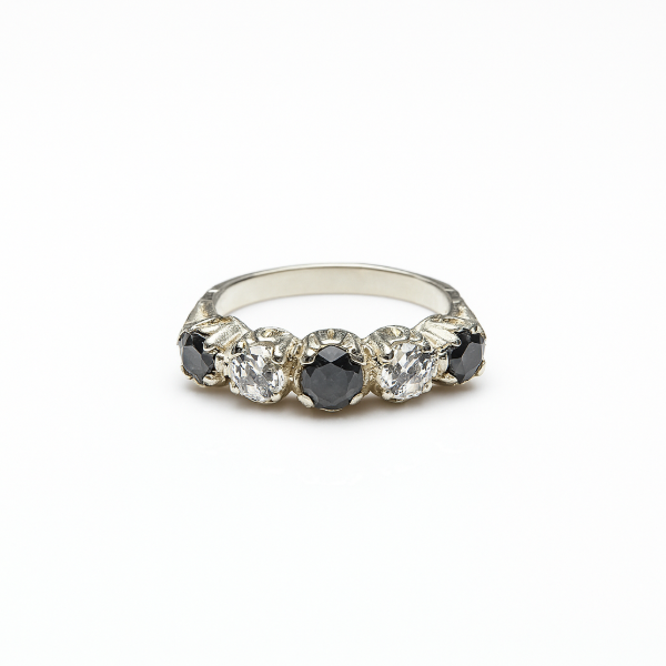 Un diseño que equilibra la luz y la sombra. Este anillo en plata 925 combina cinco piedras que se alternan entre cristales oscuros y brillantes, creando un juego de contrastes lleno de significado. Cada detalle de su engarce está trabajado con precisión, aportando textura y profundidad a una joya que habla de dualidades, fuerza y belleza atemporal.