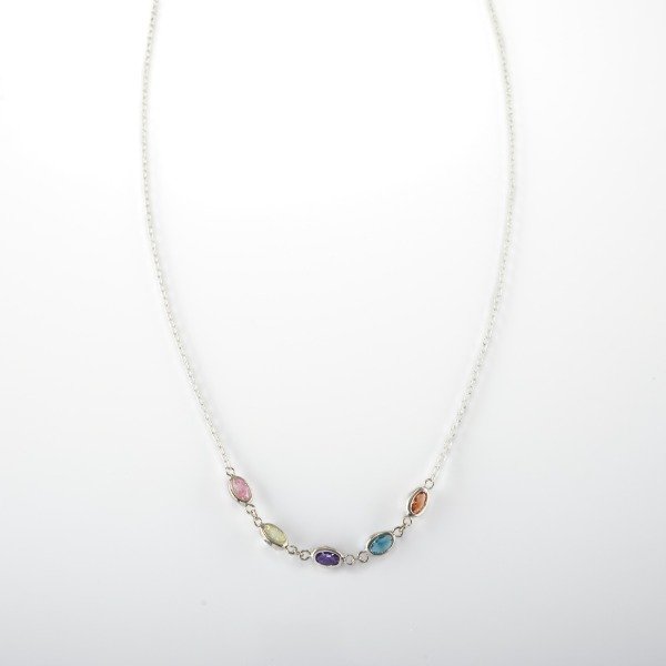 Una fina cadena de plata 925 sostiene seis piedras ovaladas facetadas en tonos rosa, verde, violeta, azul, turquesa y ámbar, creando una armonía luminosa y elegante.